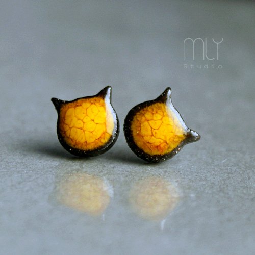 Efektowne kolczyki w formie sztyftów, ręcznie wykonane z delikatnej czekoladowobrązowej gliny kamionkowej, jednostronnie szkliwione żółtym szkliwem, na antyalergicznych sztyftach.długość elementu ceramicznego ok. 11mm, Polecam
