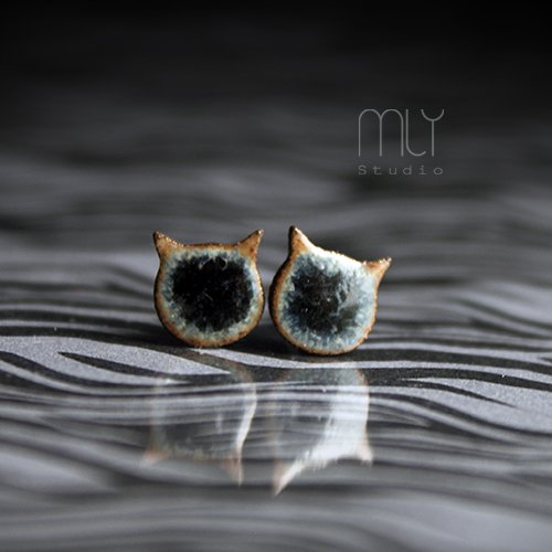 Efektowne kolczyki w formie sztyftów, ręcznie wykonane z delikatnej czekoladowobrązowej gliny kamionkowej, jednostronnie szkliwione szarogranatowym szkliwem, na antyalergicznych sztyftach w kolorze srebrnym.długość elementu ceramicznego ok. 11mm, Polecam