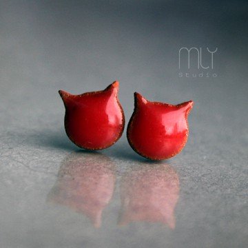 Efektowne kolczyki w formie sztyftów, ręcznie wykonane z delikatnej czekoladowobrązowej gliny kamionkowej, jednostronnie szkliwione czerwonym szkliwem, na antyalergicznych sztyftach w kolorze srebrnym.długość elementu ceramicznego ok. 11mm