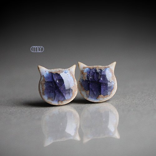 Efektowne kolczyki w formie sztyftów, ręcznie wykonane z delikatnej gliny kamionkowej, jednostronnie szkliwione beżowym i błekitno fioletowym szkliwem z efektem spękań, na antyalergicznych sztyftach w kolorze srebrnym.długość elementu ceramicznego ok. 10mm, Polecam