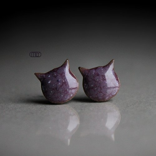 Efektowne kolczyki w formie sztyftów, ręcznie wykonane z delikatnej czekoladowobrązowej gliny kamionkowej, jednostronnie szkliwione fioletowym szkliwem, na antyalergicznych sztyftach w kolorze srebrnym.długość elementu ceramicznego ok. 11mm, Polecam