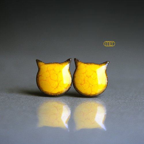 Efektowne kolczyki w formie sztyftów, ręcznie wykonane z delikatnej czekoladowobrązowej gliny kamionkowej, jednostronnie szkliwione żółtym szkliwem z efektem plamek, na antyalergicznych sztyftach w kolorze srebrnym. długość elementu ceramicznego ok. 11mm, Polecam