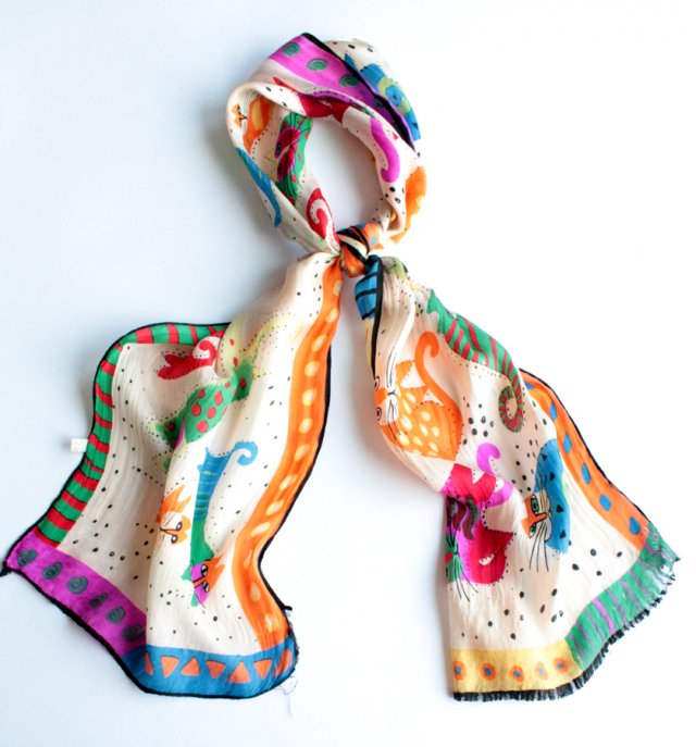 Zwiewny szal w urocze kotki,wykonany prawdopodobnie z jedwabiu.