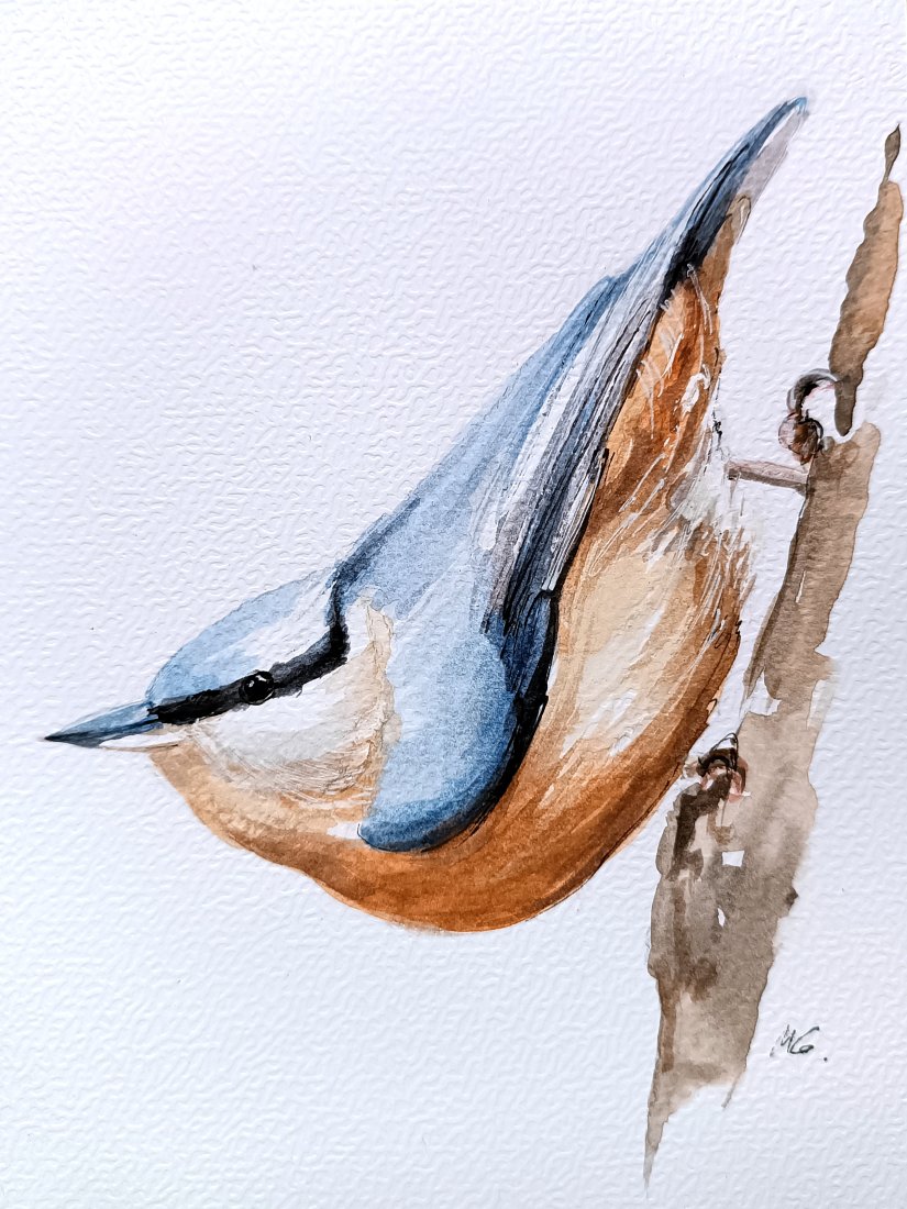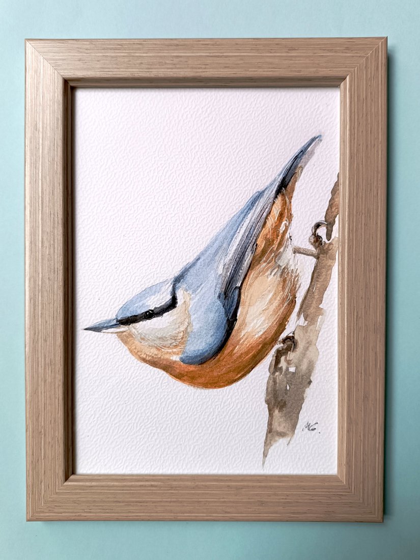 Kowalik.Ptaszek, który potrafi schodzić glową w dół po pniu! Ręcznie malowana akwarelka na papierze 300g, farbami i tuszami Derwent, z użyciem cienkopisów Winsor & Newton i Sakura.Jest to oryginał, oprawiony w ramkę imitację jasnego drewna, za szkłem. Wymiary całości 20,3x15,3cm. Idealny prezent dla miłośnika ptaków! :-)