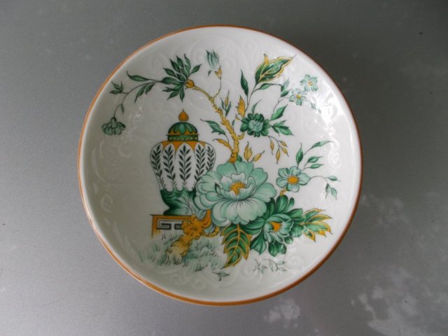 Porcelanowy, szlachetny i fantastycznie zdobiony talerzyk buduarowy, kuchenny, orientalizujący... Sygnowany CROWN Staffordshire. Fine Bone China England z serii KOWLOON. Delikatne faktura podszkliwnego wzoru...zdobienie subtelne, wykwintne...jak ręcznie piórkiem malowane. Wzór delikatnie wyczuwalny i widoczny pod szkliwem.Fantastyczne zniuansowanie zieleni i szczypta koloru miodowego.. rant również miowdowy. Jedwabiste błyszczące szkliwienie.