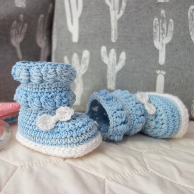 Buciki wykonywane są z włóczki przeznaczonej na wyroby dziecięce. Mogą zostać wykonane dla dziecka w wieku 0-3 miesiące lub 3-6 miesięcy.