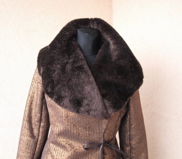 Śliczny sztuczny kożuszek marki Bandolera. Piękny taliowany fason z ogromnym kołnierzem. Zawiązywany z boku rzemykami. Kolor przecierany miedziany, futerko ciemnobrązowe. Stan idealny. Rozmiar z metki - 38. Podaje wymiary mierzone na płasko;