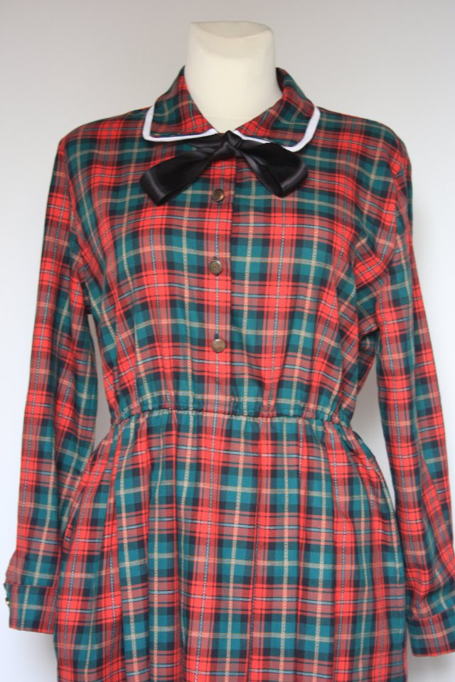 sukienka vintage w czerwono-zieloną kratę, zapinana do połowy na guziki, pod szyją wiązana czarną tasiemką, podwójny kołnierzyk, w pasie gumka, dwie kieszenie, posiada szlufki - paska brak