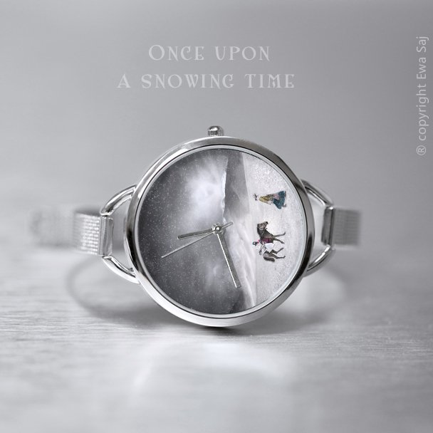 Niepowtarzalny, autorski zegarek z limitowanej kolekcji Kraina Śniegu. Wielkość tarczy zegarka 38 mm, szerokość paseczka 8 mm.