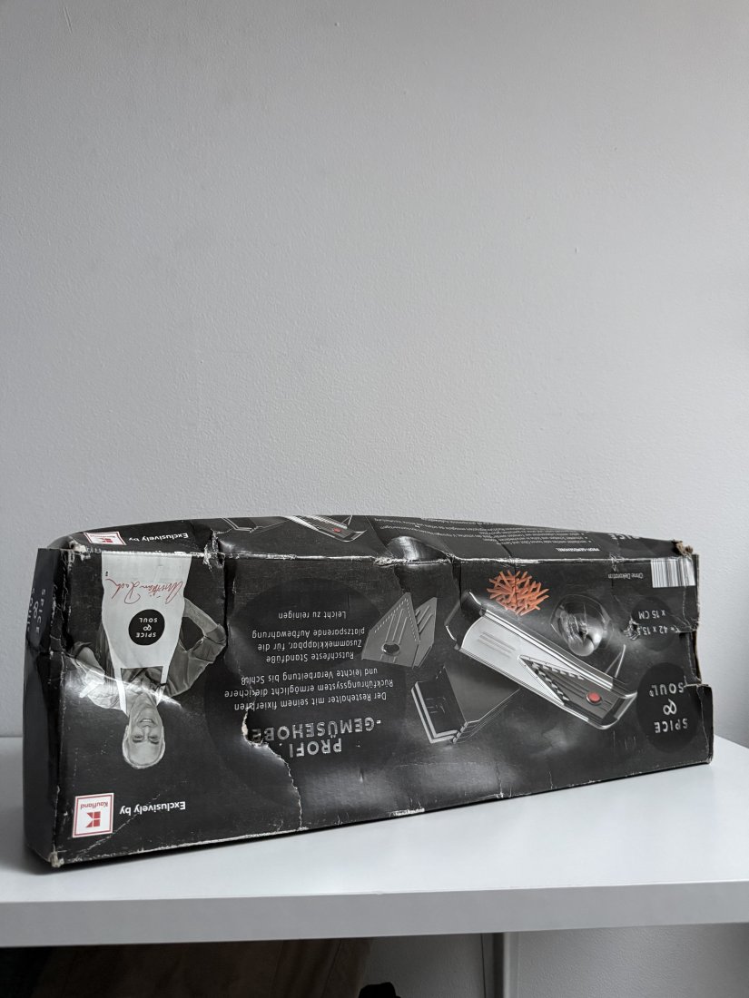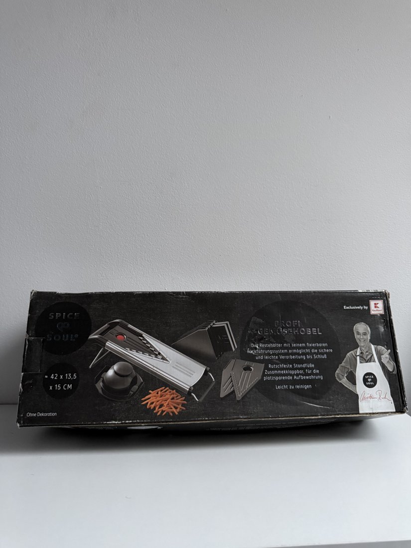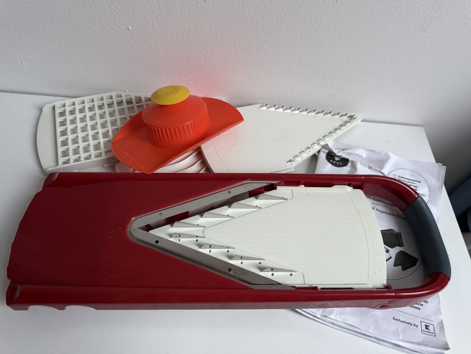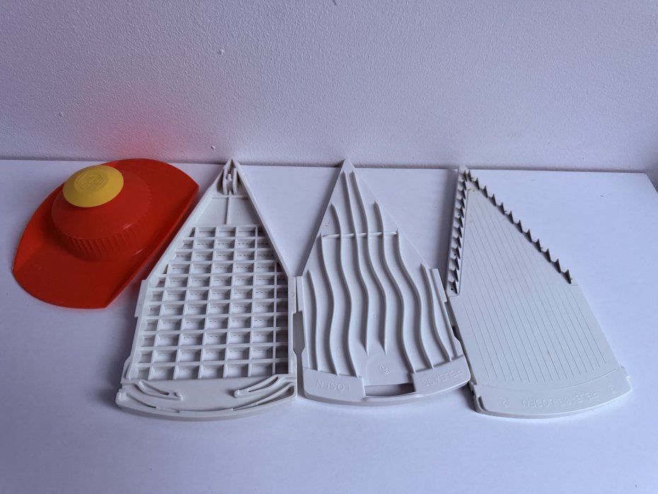 Krajalnica z nakładkami, zestaw. Pomarańczowy uchwyt jest z innego kompletu. Pudełko pogniecione.