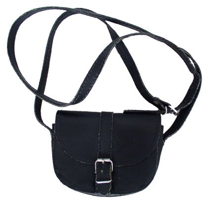 maleńka torebka z czarnej skóry naturalnej,zapinana na sprzączkę ,pasek długi regulowany.Stan bardzo dobry,wysokość 10cm,szerokość 13cm.