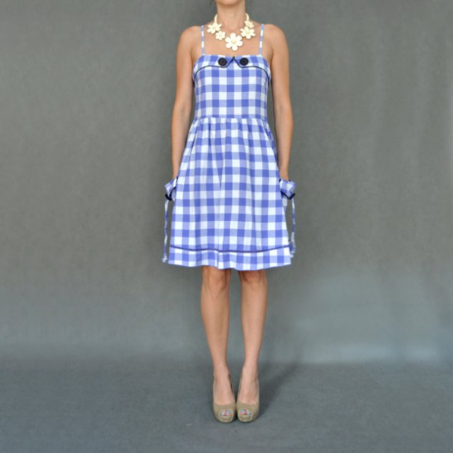 Sukienka w fioletową kratkę wykonana z flanelowej bawełny. Góra ozdobiona guziczkami, na dole dwie, ciekawe kieszonki. Z tyłu gumka. Z boku zameczek.