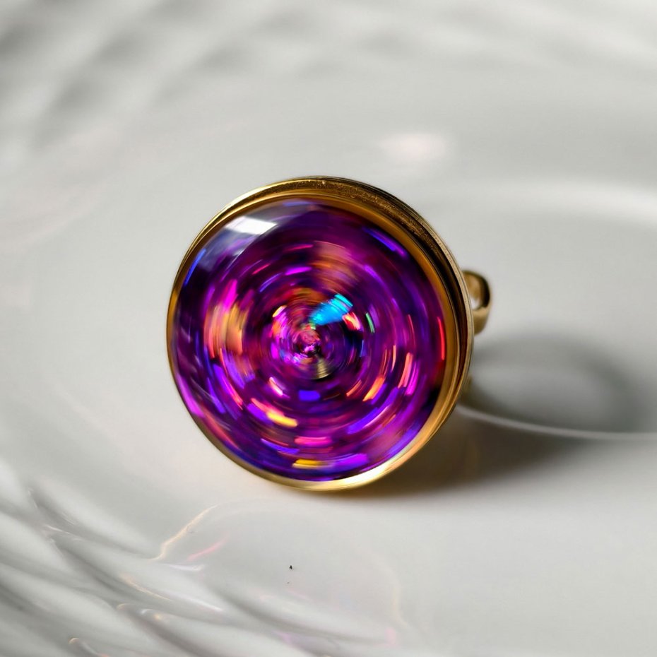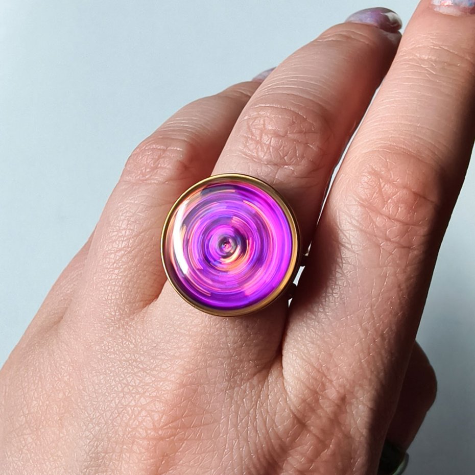 Ten autorski pierścionek z pozłacanej stali szlachetnej to połączenie nowoczesnej formy i artystycznej swobody. Centralnym elementem jest oczko z kolorowym pyłkiem zatopionym w żywicy, które subtelnie obraca się wokół własnej osi, za każdym razem ukazując inny układ barw i refleksów światła.