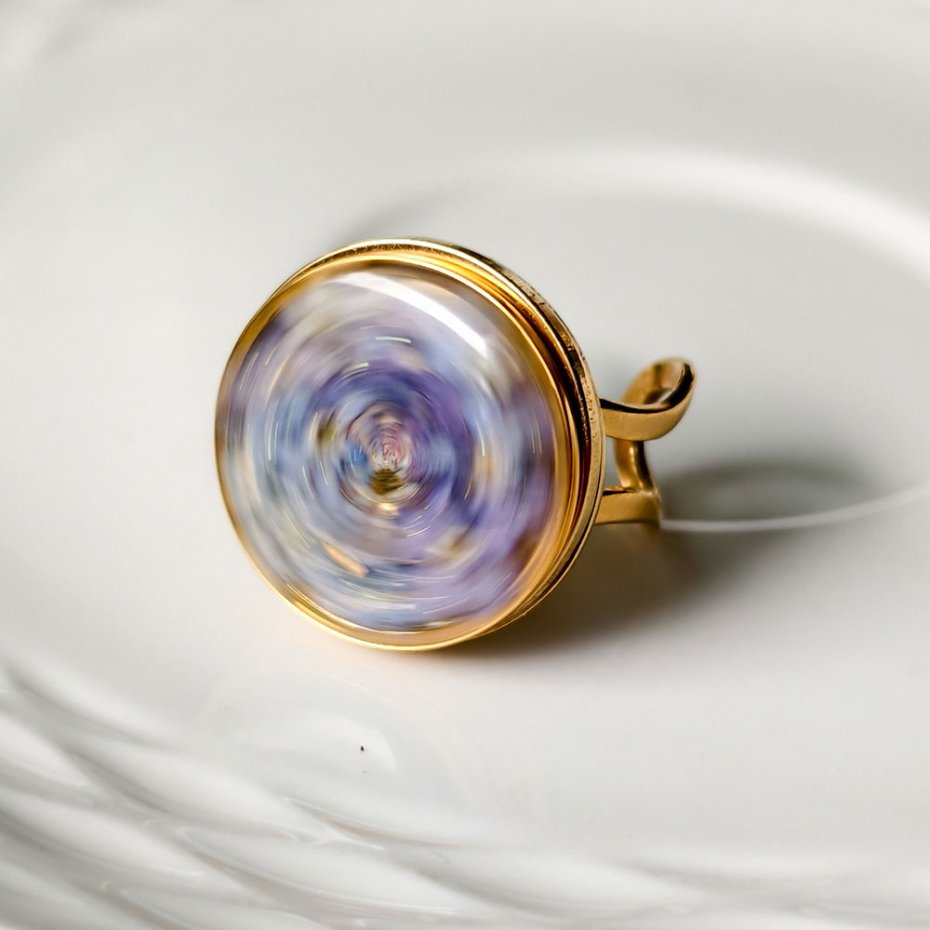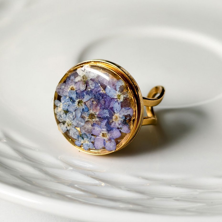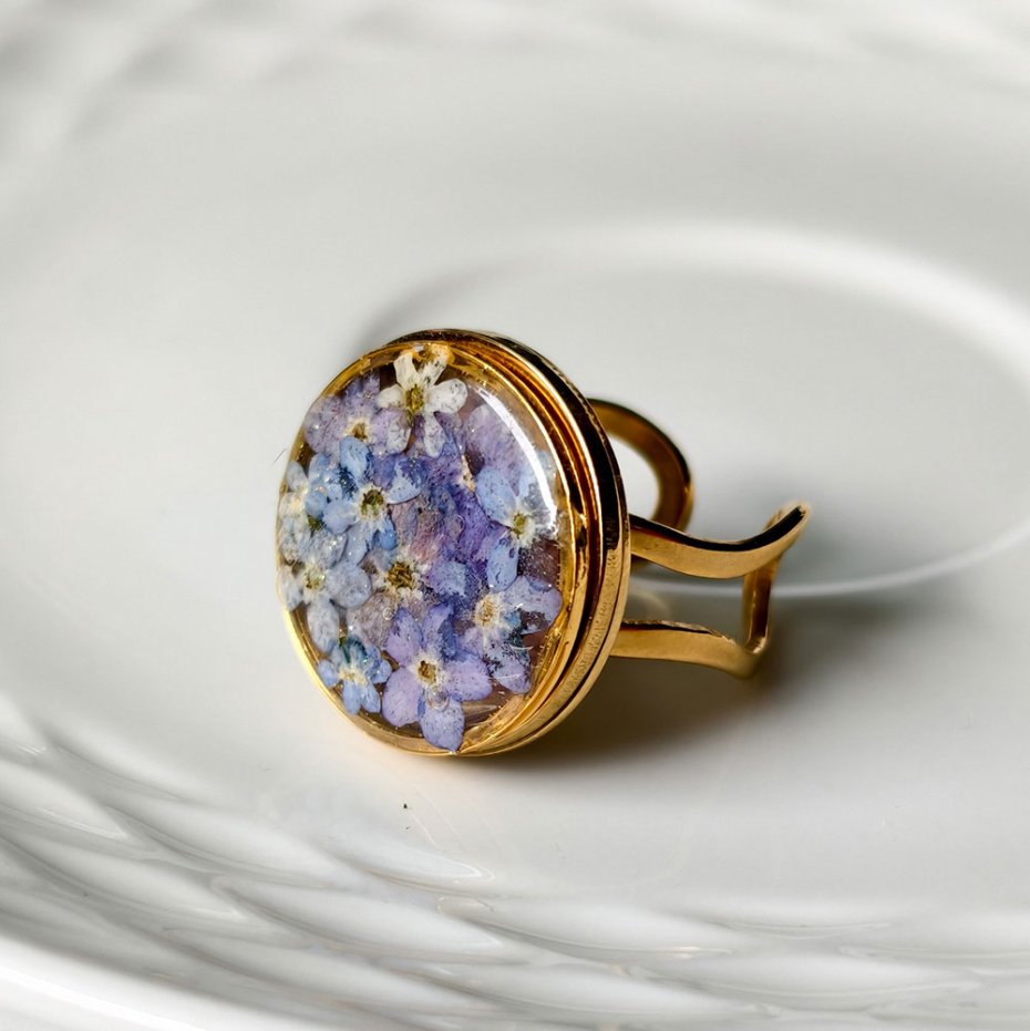 Ten autorski pierścionek z pozłacanej stali szlachetnej to biżuteria z emocją. W jego centralnym oczku zostały zatopione prawdziwe niezapominajki, które sama zbierałam i suszyłam, by zachować ich delikatność i naturalne piękno. Każdy kwiat jest autentyczny, dzięki czemu każdy pierścionek jest jedyny w swoim rodzaju.