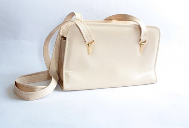 Kremowa elegancka torba wykonana prawdopodobnie ze skóry ekologicznej.