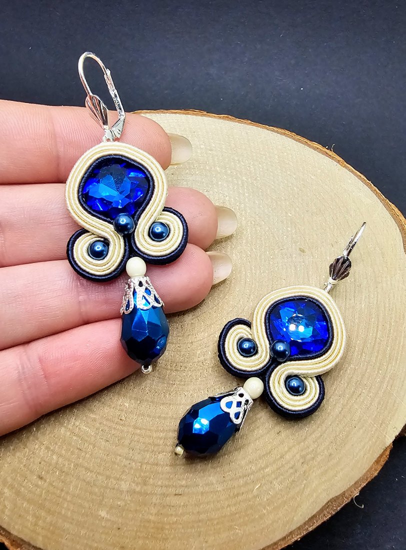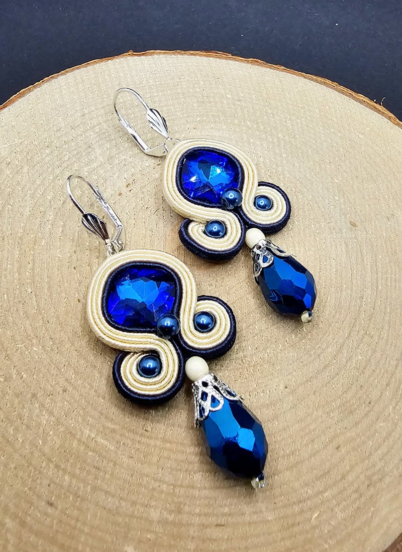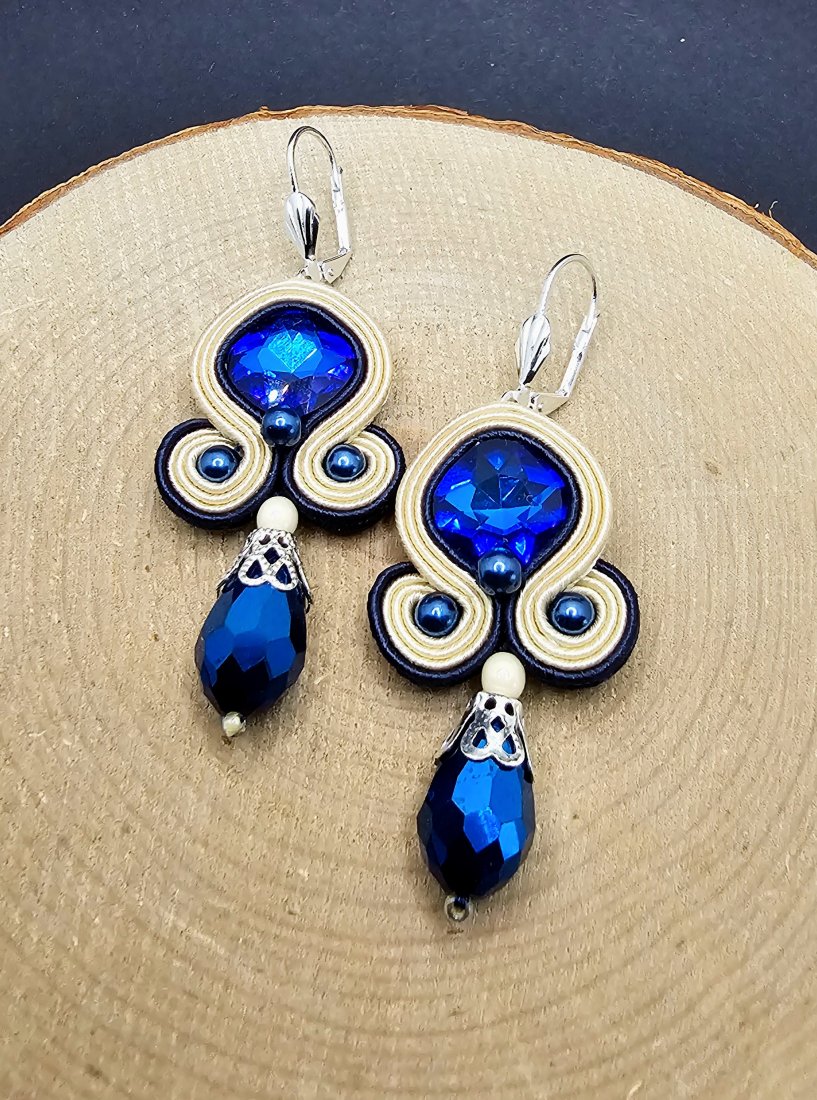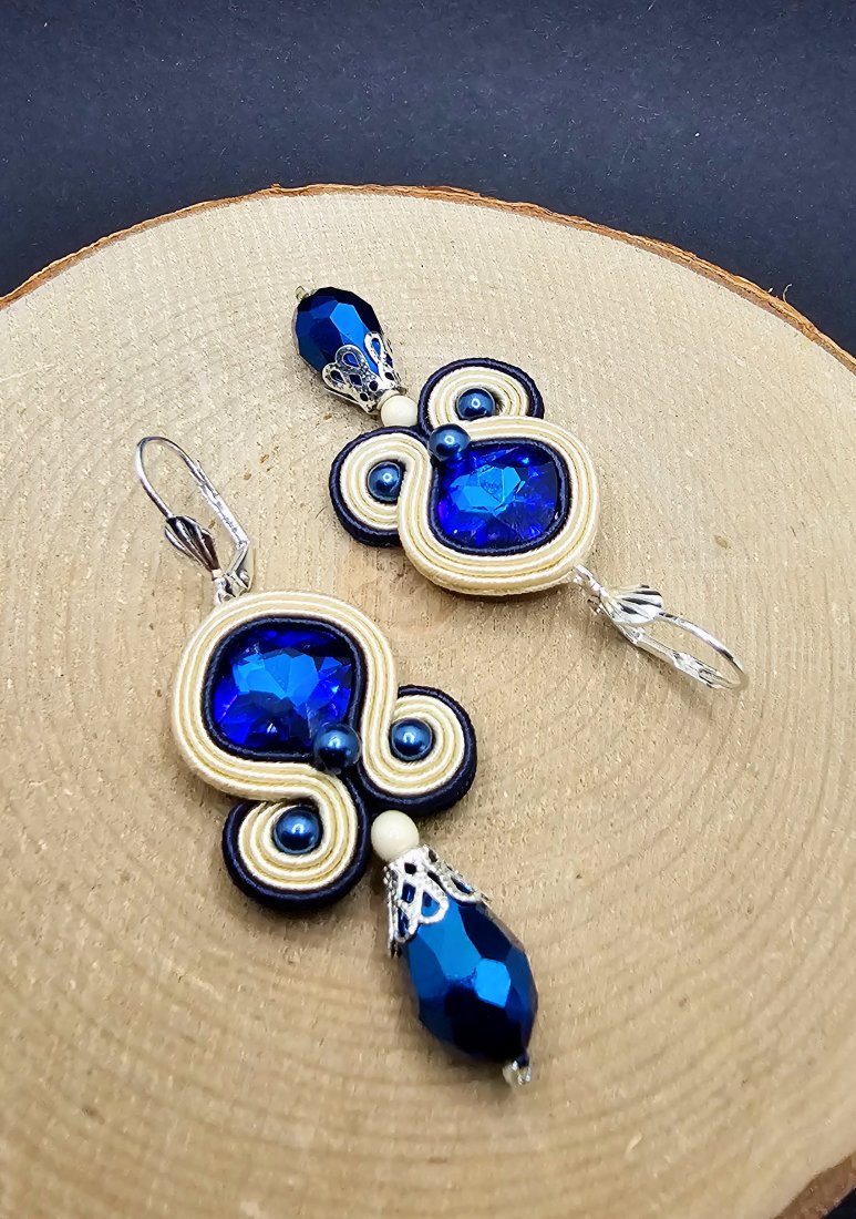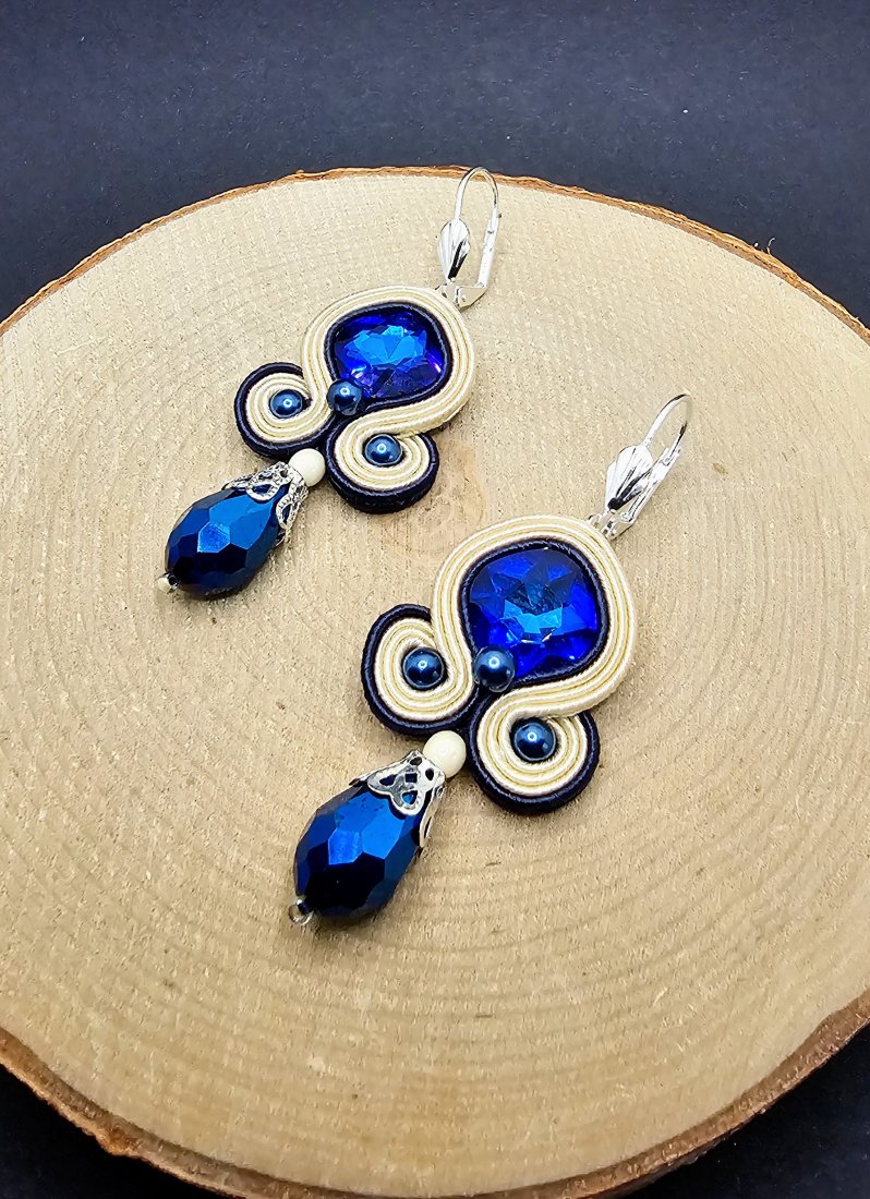 Szklane fasetowane kryształki otoczone sznurkami sutasz oraz szklanymi perłami. Dół kolczyków zdobią wiszące fasetowane szklane krople. Kolczyki zamocowane na metalowych biglach angielskich w kolorze srebrnym. Kolory w kolczykach: kremowy, granatowy, srebrny.