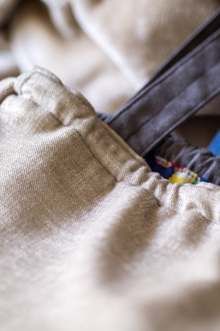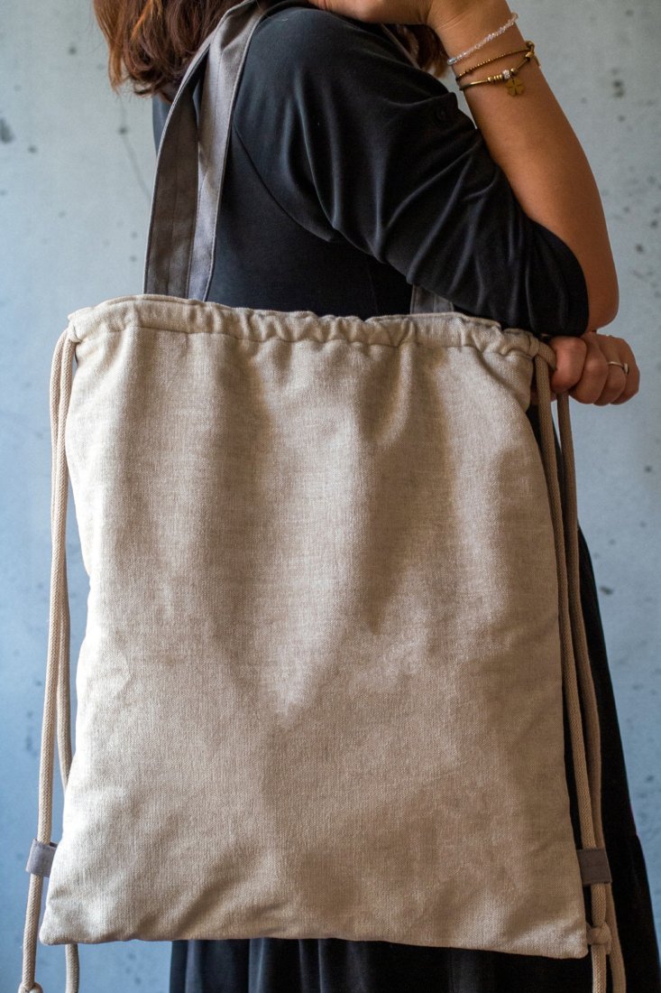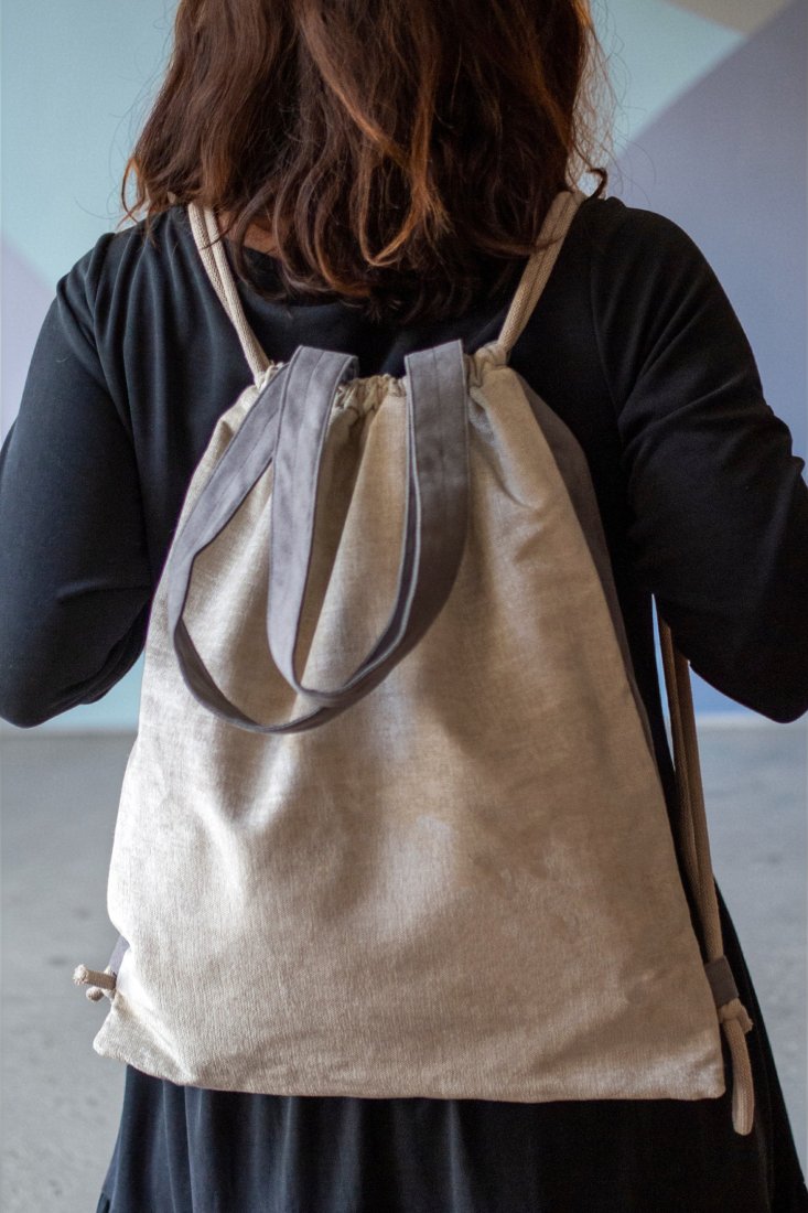 Plecakotorba worek 2w1 wykonana z tkaniny typu welur w kolorze kremowym w połączeniu z szarym nubukiem.