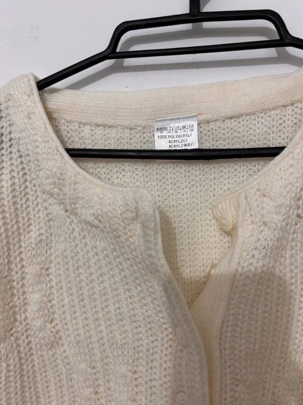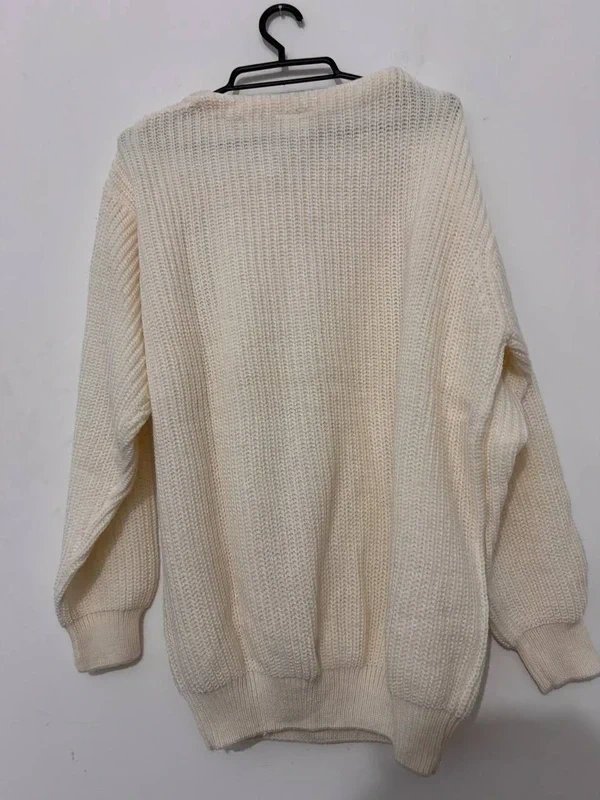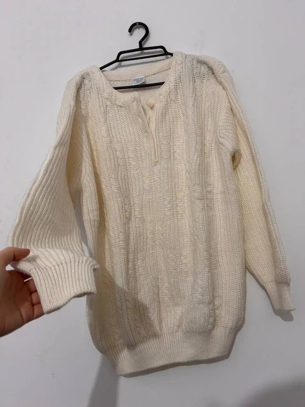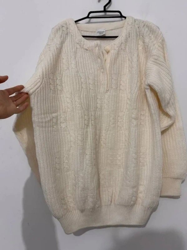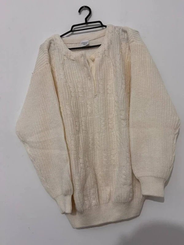 Miękki, kremowy sweter o grubym, ozdobnym splocie. Klasyczny krój z delikatnym rozpinanym wykończeniem przy dekolcie i elastycznymi ściągaczami na dole oraz przy rękawach. Idealny na chłodne dni — lekki, a jednocześnie bardzo ciepły i wygodny.