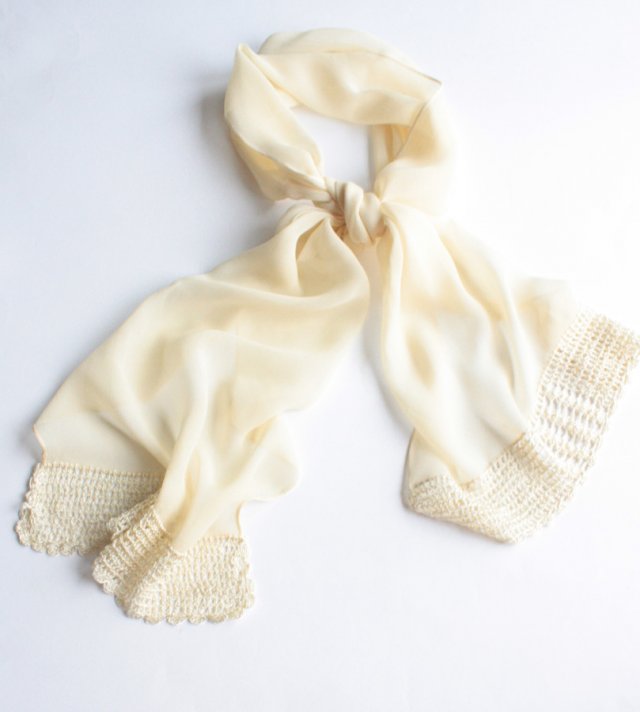 Zwiewny szal w kolorze kremowym, o ciekawie wykończonych brzegach wykonanych ręcznie z jedwabnego kordonku. Materiał to prawdopodobnie żorżeta jedwabna.
