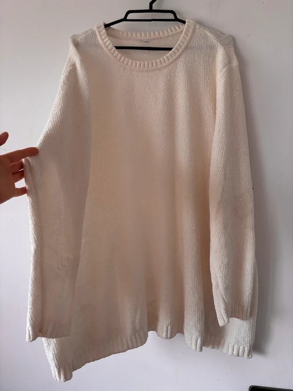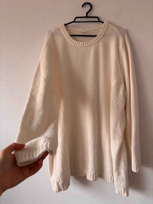 chenille sweater, cream sweater, plush sweater, oversized, fluffy sweater, warm sweater, winter sweater, ecru, ivory, long sleeve, loose fit, size soft sweater, acrylic sweater, casual, boho, Scandi style, everyday sweater, Vinted, chenille knit, cream color, cozy sweater, ribbed texture, plus size, winter fashion, Bangladesh made, textured knit, plain sweater, comfy sweater