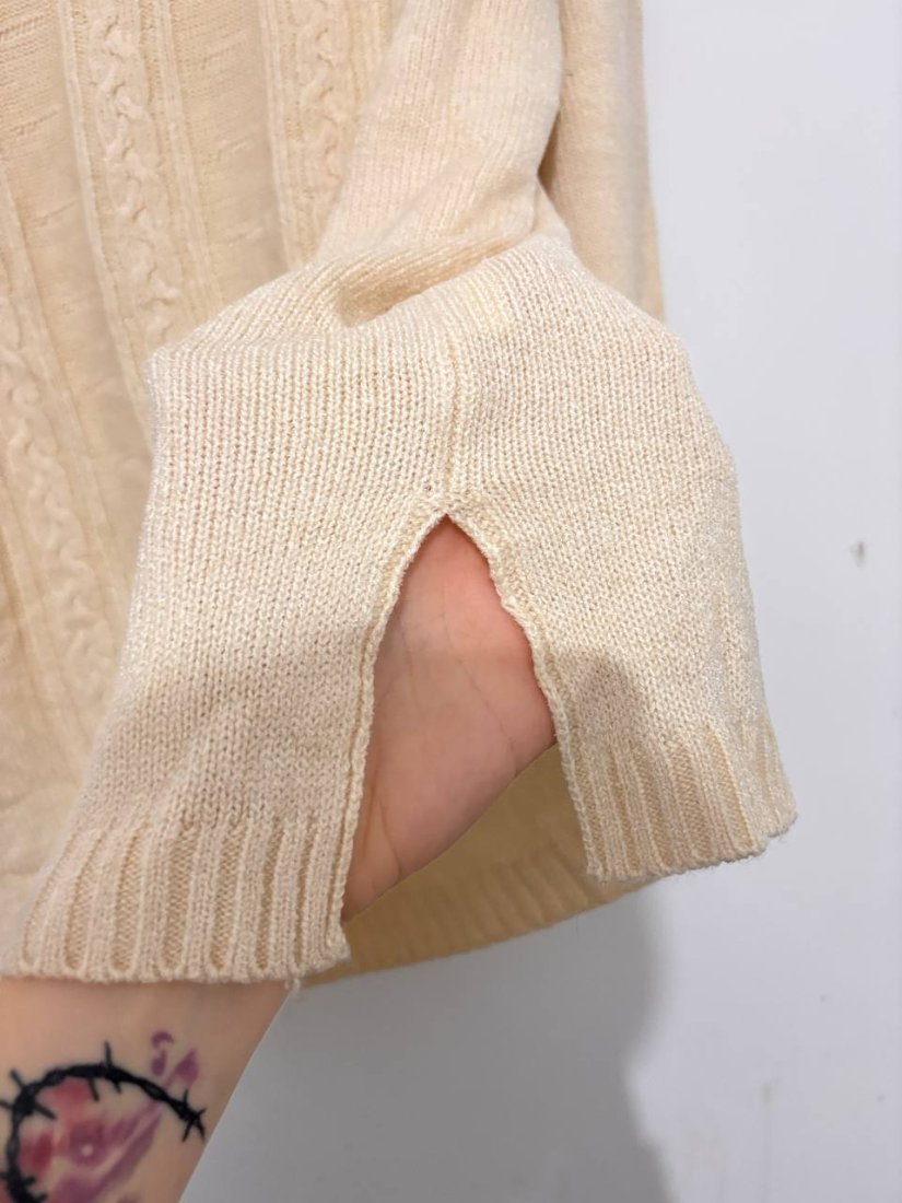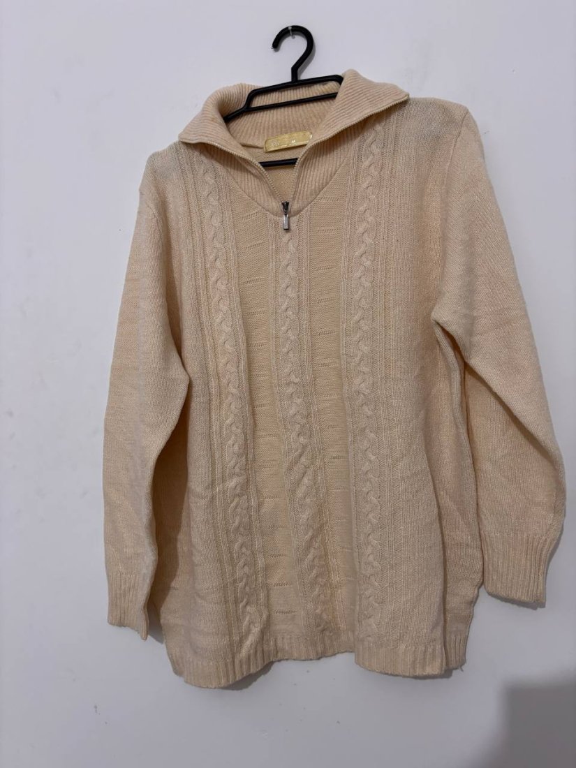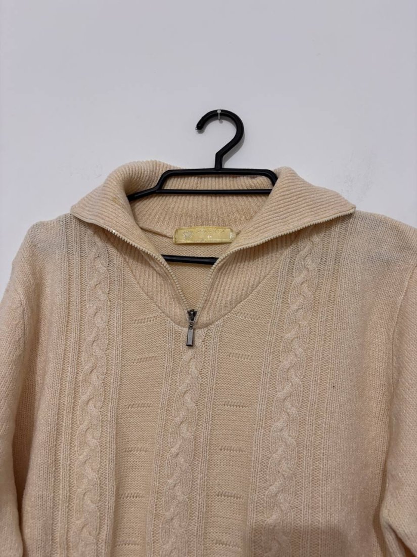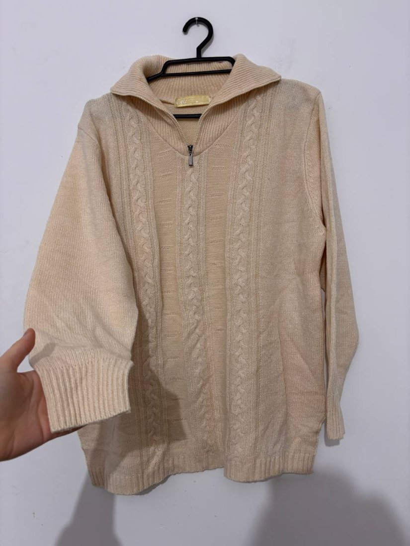 cream sweater, zip sweater, half zip knit, cable knit sweater, warm sweater, soft sweater, beige knit, wool blend sweater, cozy sweater, autumn sweater, winter sweater, classic knitwear, everyday sweater, casual knit, oversized sweater, knitted pullover, women sweater, neutral sweater, stylish knit, warm pullover