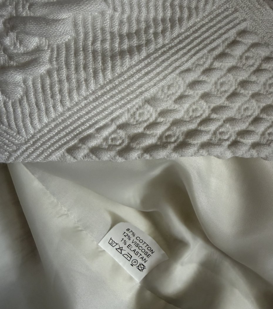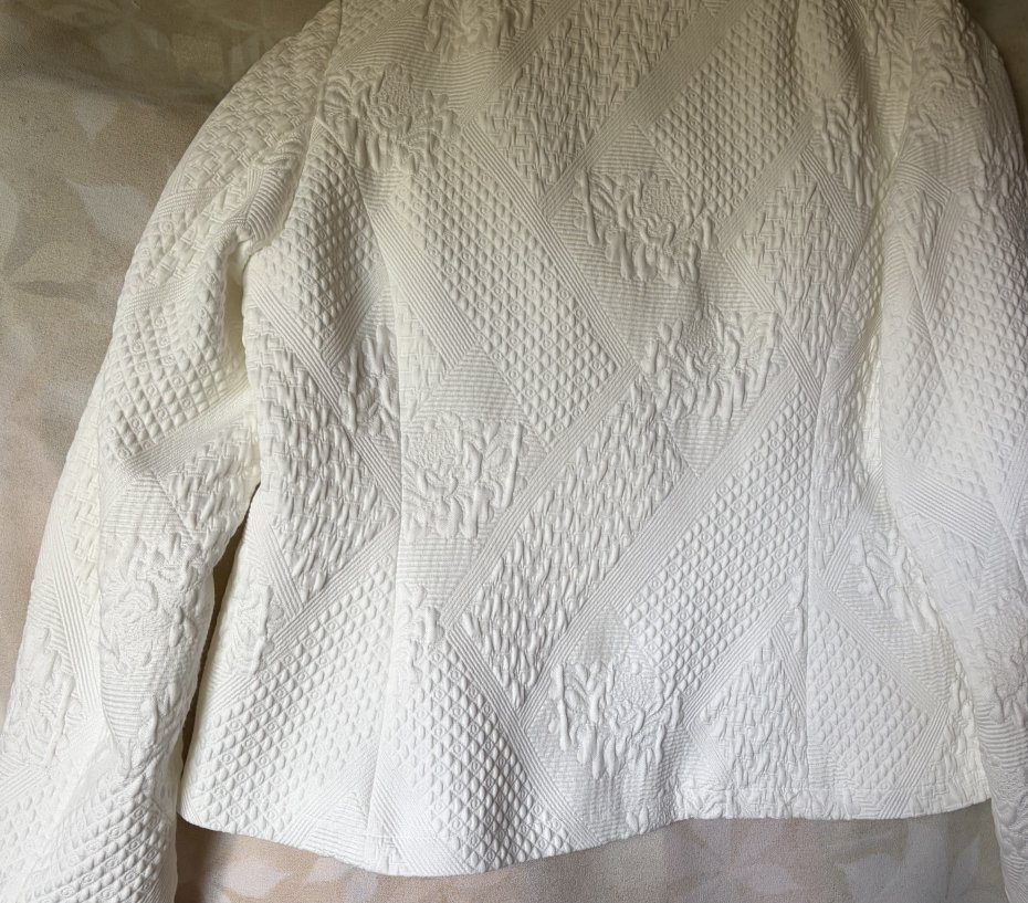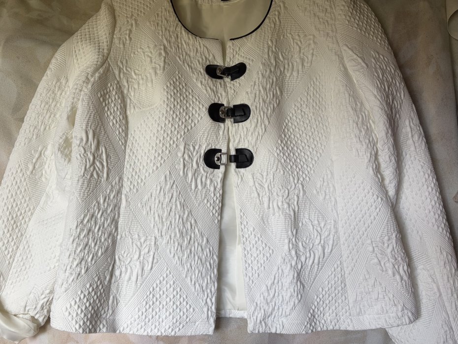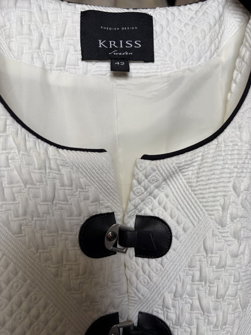 Żakiet typu Chanelka - KRISS SVEDEN -SWEDISH DRSIGN ( KRISS Sweden to szwedzka marka odzieżowa specjalizująca się w projektowaniu i sprzedaży eleganckiej odzieży damskiej, w tym sukienek, bluzek i kurtek, często w stylu skandynawskim. Firma oferuje ubrania dla kobiet ceniących nowoczesny design i funkcjonalność ) . ROZMIAR 42. 87% cotton 12 % Viscose 1% elastan . Efektowny , elegancki - BLACK AND White . Kredowa biel mięsistej fakturowej tkaniny , czarna lamówka przy dekolcie , oraz jak biżuteria ozdobne trzy ozdobne , jakościowe zapięcia . Podszewka . Długie rękawy ,delikatne poduszki na ramionach, subtelne taliowanie z tyłu . . Ramiona 40 cm pachy 51 talia 49 dol 55 długość rękawów od pachy 44 szerokość rękawa na dole prawie 14 cm. wymiary podane z mierzenia na płasko . bez rozciągania Stan zachowania bardzo dobry, minimalne ślady użytkowania . Metka firmowa i metka ze składem obecne :)