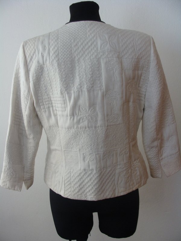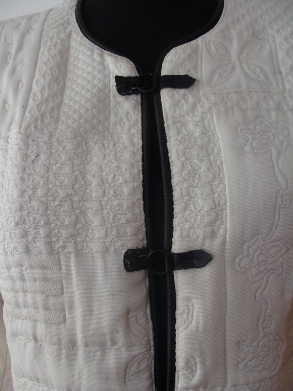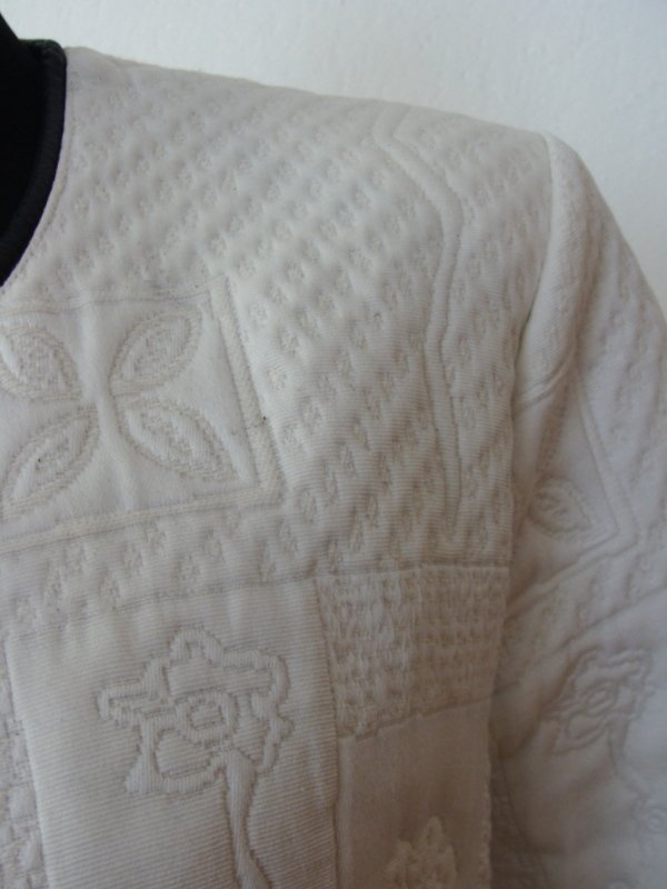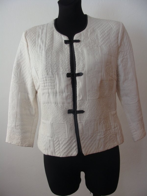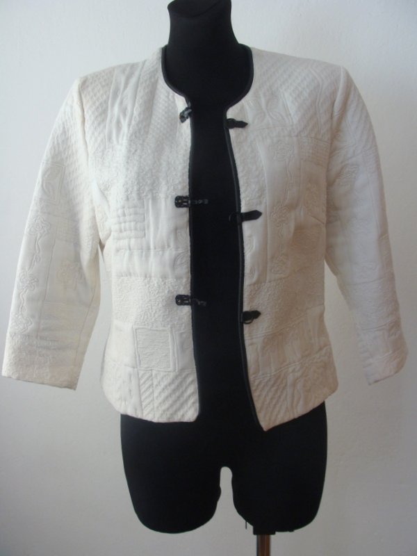 Oryginalna kurtka lub marynarka w orientalnym stylu z żakardowej tkaniny w wytłaczane wzory w białym kolorze, z czarnymi lamówkami. Bez kołnierza, zapinana na trzy ozdobne zapięcia na haftki, rękawy 3/4. Całość na podszewce.