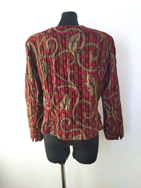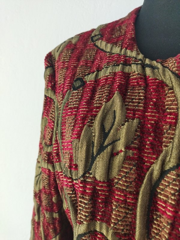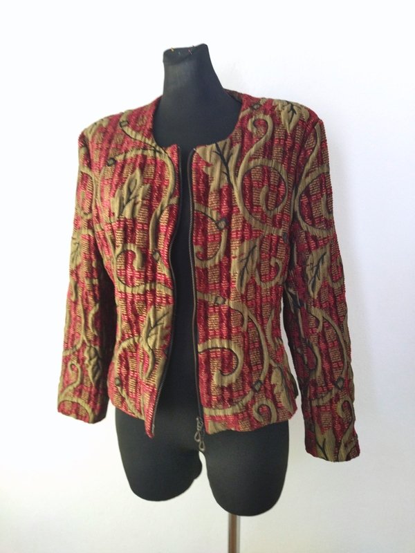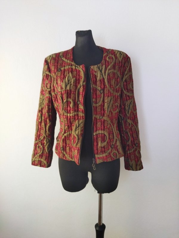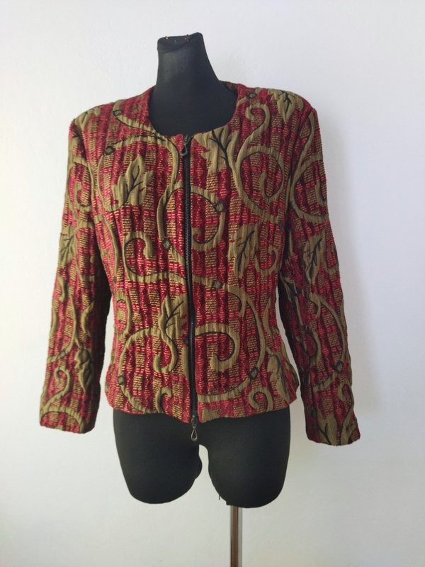 Krótka wzorzysta kurtka lub marynarka z wiskozowo-poliestrowej tkaniny z ciekawą fakturą w kolorystyce burgundu , oliwki, brązu i czerni. Zapinana na zamek . na podszewce
