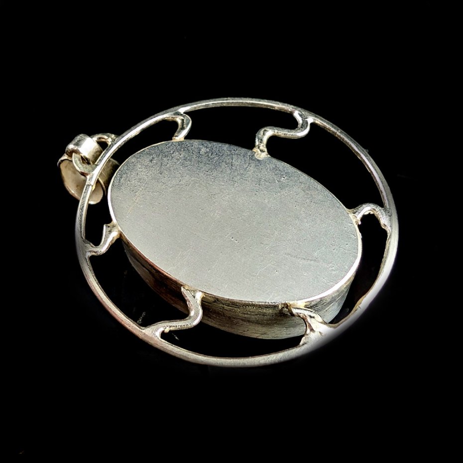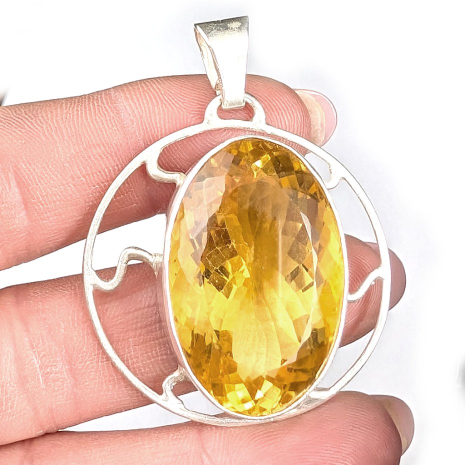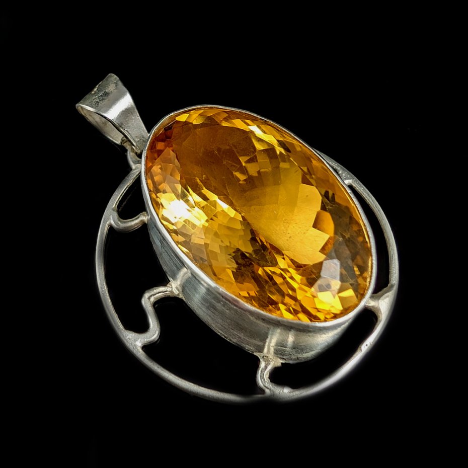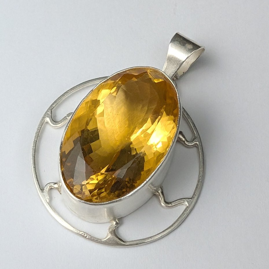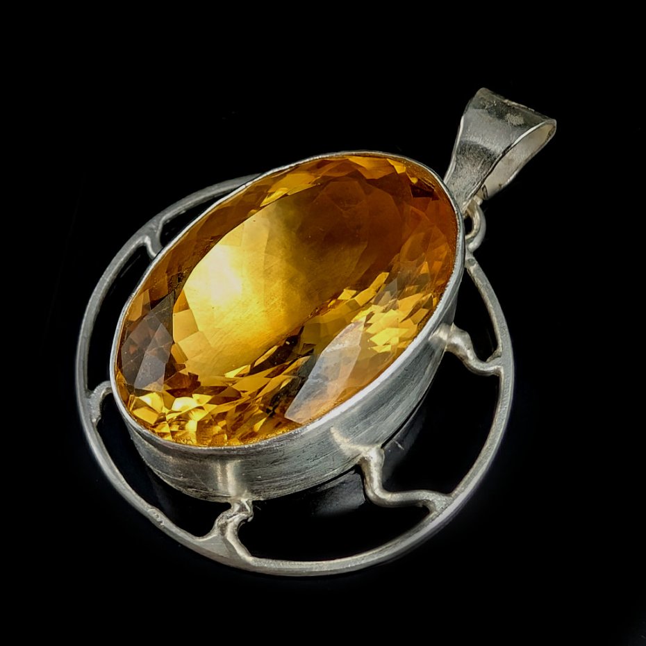 Okazały wisior wykonany ze srebra pr. 925 oraz przepysznego cytrynu. Piękny szlif oraz barwa. Średnica całej oprawy 36 mm. Długość z krawatką 50 mm, wymiary oprawy kamienia 31 x 21 mm, waga 21 g. Wisior zostanie zapakowany w ozdobne pudełeczko.