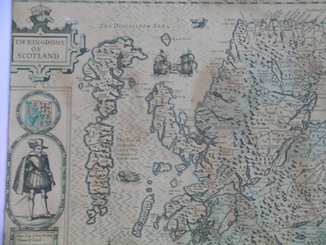 Duży, ciekawie i przyjemnie stary papierowy wydruk z mapą Szkocji za czasów króla Jakuba. Fantastyczne drobiazgi w rysunkach, np. potwory morskie. Oglądanie jej bardzo wciąga, zwłaszcza jeśli kocha się tę krainę :) Wydrug zagięty na cienkiej płycie wiórowej, stemplowanej. Do oprawienia. 40 x 50 cm. Stan zachowania wintydżowy, dobry :)