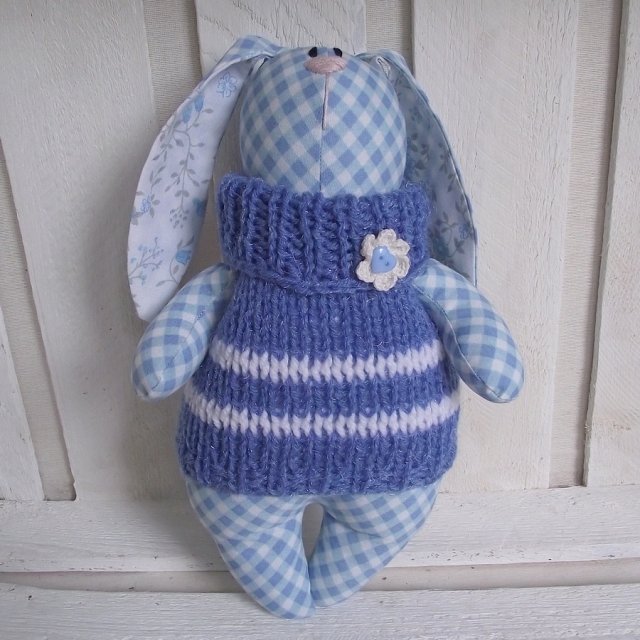 Królik uszyty z bawełny. Sweterek wykonany z włóczki akrylowej. Wypełniony wkładem poduszkowym. Wielkość 27cm + uszy 15cm.
