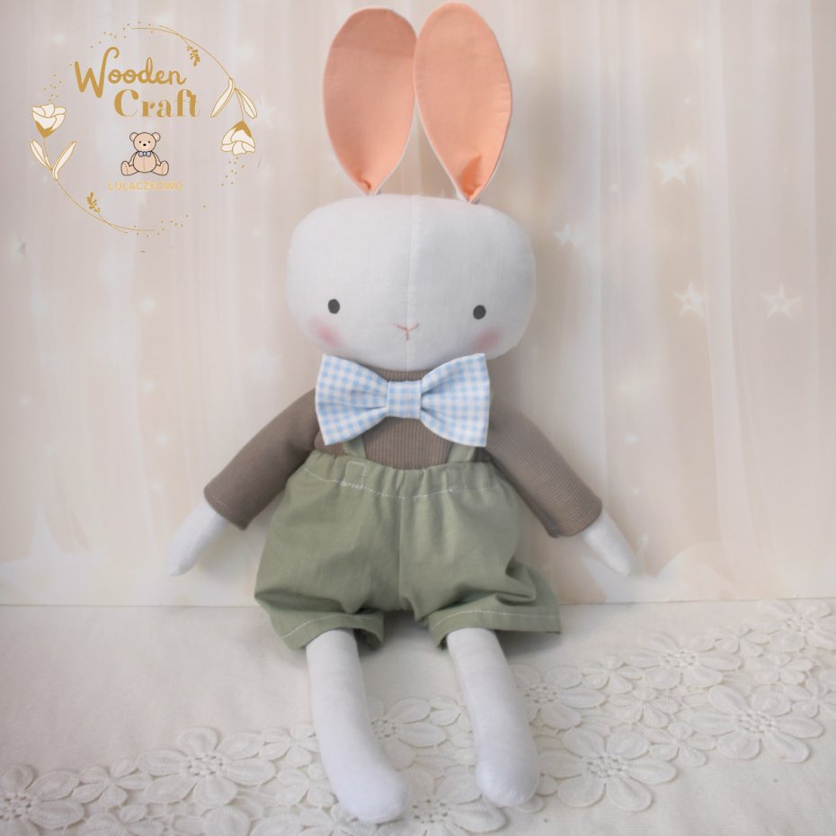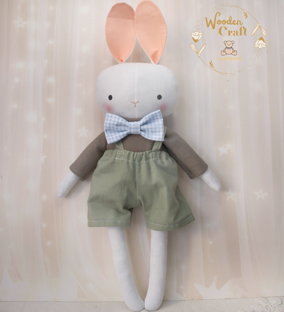 Przeurocza przytulanka, króliczek cały w bieli, uszyty ręcznie z najwyższą starannością, ubrany w brązowy sweterek, oliwkowozielone spodenki oraz błękitną muszkę w kratkę. Wykonany ze 100% bawełny, wypełniony antyalergiczną kulką silikonową. Oczka malowane wodoodpornym markerem, nosek wyszyty muliną. Spodenki, sweterek i kokardę można swobodnie zdejmować, posiadają gumeczki. Górne i dolne łapki układają się luźno, króliś siedzi z podparciem.