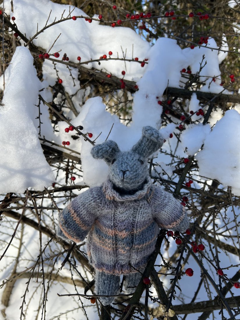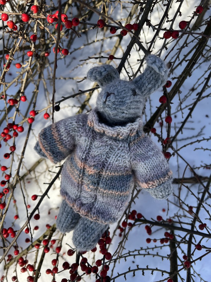 • Naturalne materiały: Ciałko króliczka to 100% czysta wełna. Sweterek został wykonany z miękkiej mieszanki z przewagą wełny (80%). Wełna jest ciepła w dotyku i bezpieczna dla dziecka.