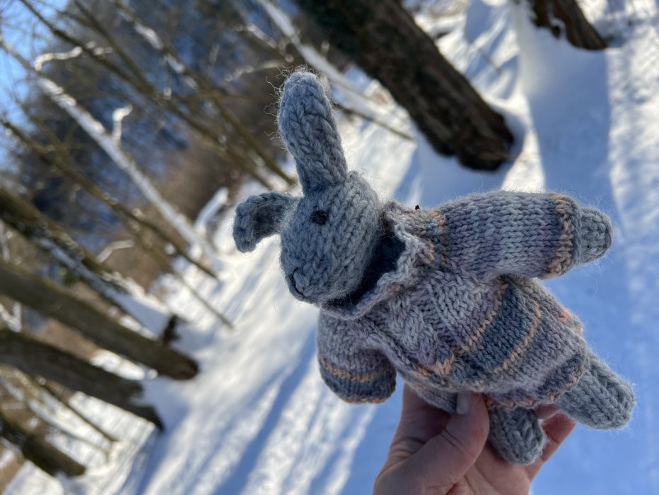 Ręcznie robiony na drutach króliczek, stworzony z miłości do natury i dziecięcej wyobraźni.