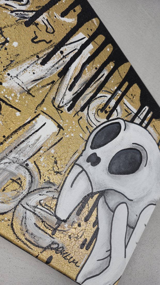 Wykonany w technice akrylowej z użyciem złota strukturalnego i wykończony markerem.