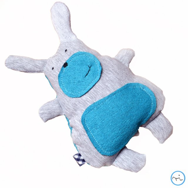 Mięciutka przytulanka wykonana została z dzianiny dresowej w kolorze szarym i turkusowym. Mierzy ok. 23 cm