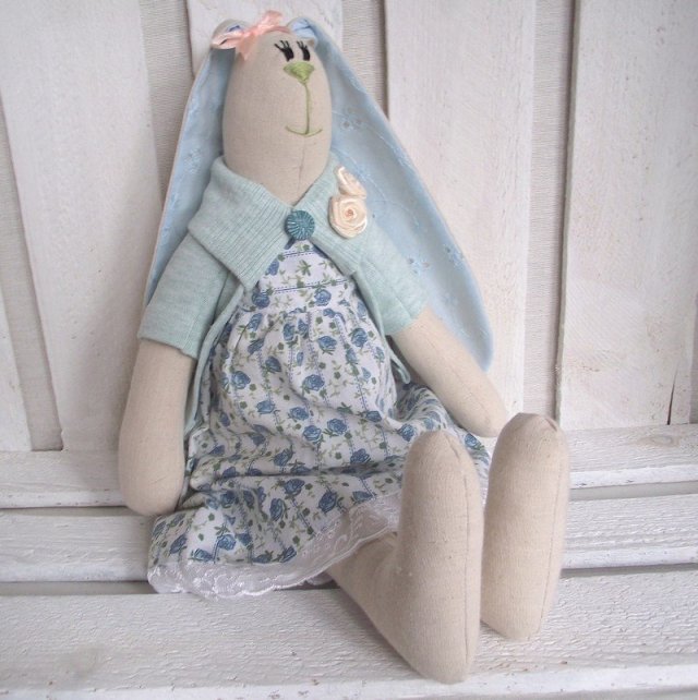 Królik uszyty z bawełnianej tkaniny. Ma ruchome nóżki i rączki. Nie zawiera wełny. Wypełniony specjalnym antyalergicznym tworzywem. Wielkość ok 40 cm.