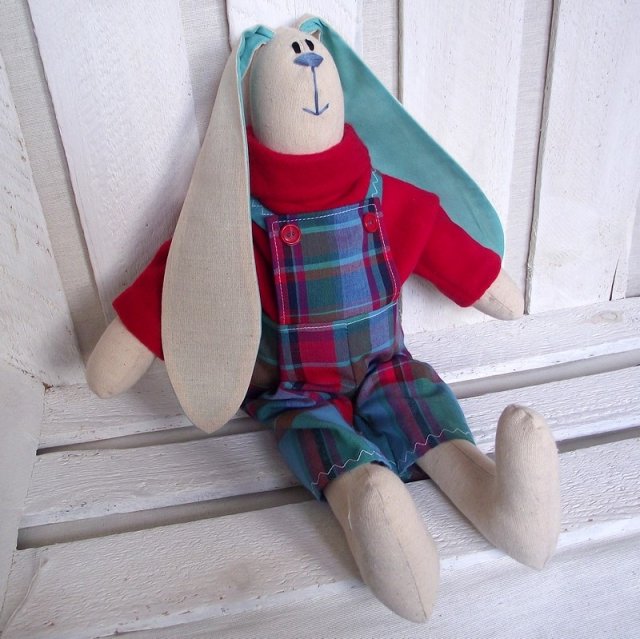 Królik uszyty z bawełnianej tkaniny. Ma ruchome nóżki i rączki. Nie zawiera wełny. Wypełniony specjalnym antyalergicznym tworzywem. Wielkość ok 40 cm.