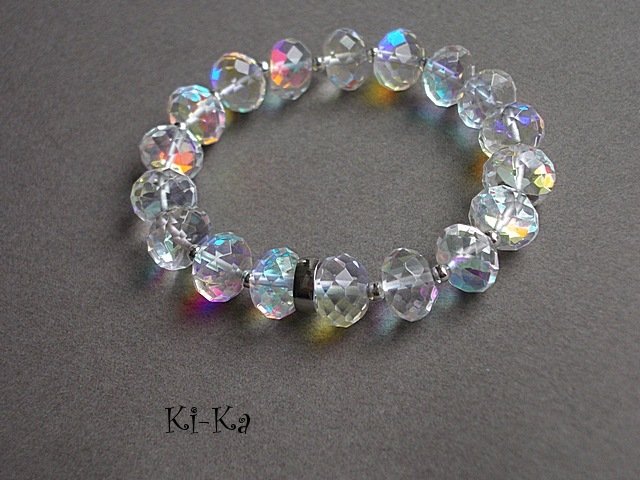 Bransoletka wykonana z elementów metalowych oraz fasetowanych oponek kryształów w kolorze AB [12mm -szkło bardzo dobrej jakości] crystal AB] . Bransoletka na gumce silikonowej .Pasuje na nadgarstek 15-16cm.Biżuteria ozdobnie zapakowana. Bransoletka może stanowić komplet z innymi bransoletkami -zdjęcia