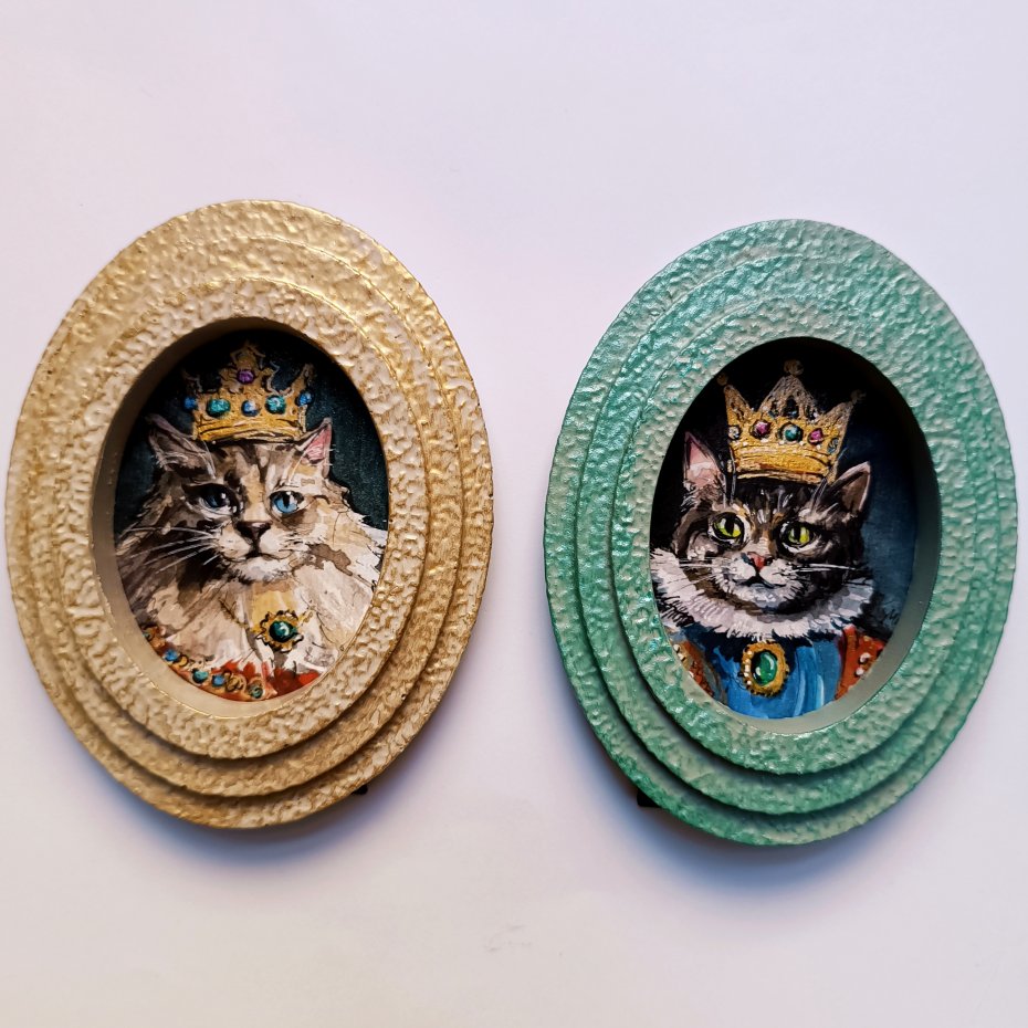 Jak powszechnie wiadomo to nie człowiek ma kota, tylko kot ma człowieka ;-) Dlatego też przedstawiłam je w pełnym splendorze jako Królów :-) Małe obrazki namalowane farbami akwarelowymi i akrylami o metalicznym połysku, z użyciem cienkopisów i złotego gellpena. Obrazki są oprawione w owalne ramki, również podmalowane metaliczna farbą. Są przeznaczone do postawienia. Obrazki nie posiadają szybki, natomiast są zabezpieczone specjalnym lakierem firmy Talens. Wymiar pojedynczego obrazka razem z ramką to 11,5cm x 9cm. Podpisane na odwrocie. Jedyne takie egzemplarze. Sprzedaję w parze. Na życzenie mogę je rozdzielić. Zapraszam, Monika