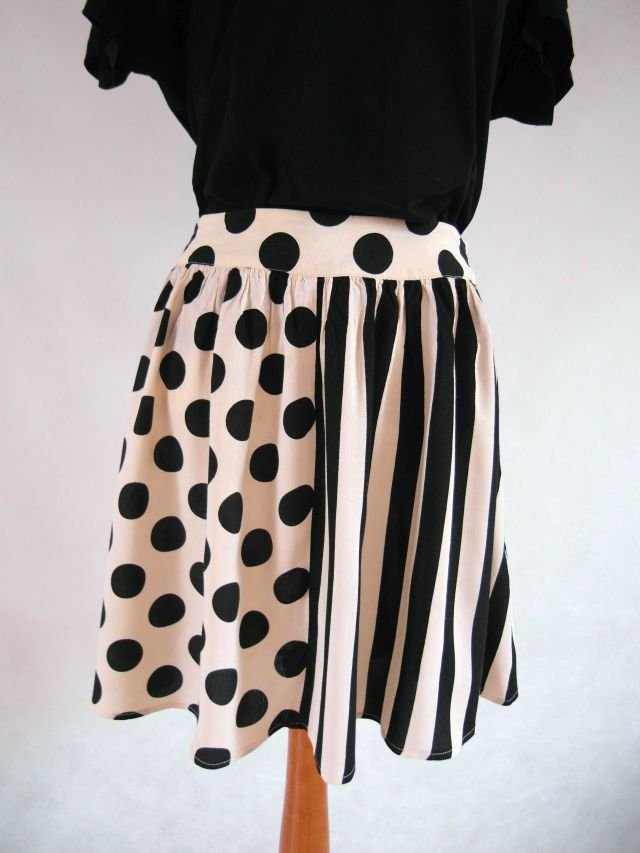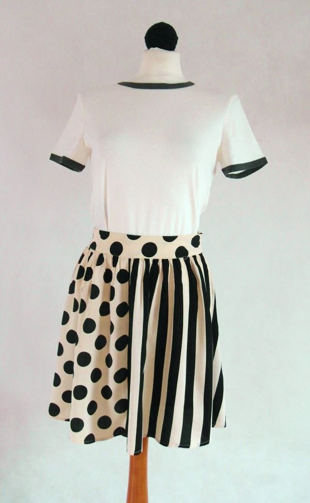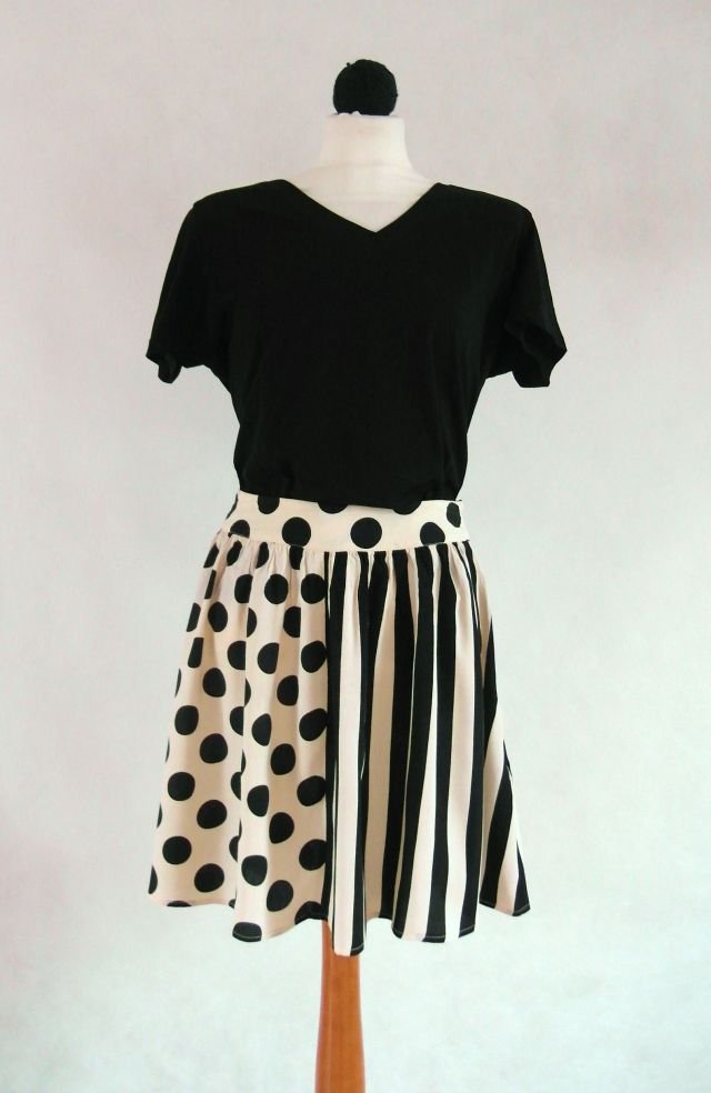kolor - waniliowe ecru i czarne pasy oraz grochy.Tańcząca. Z boku na suwak.