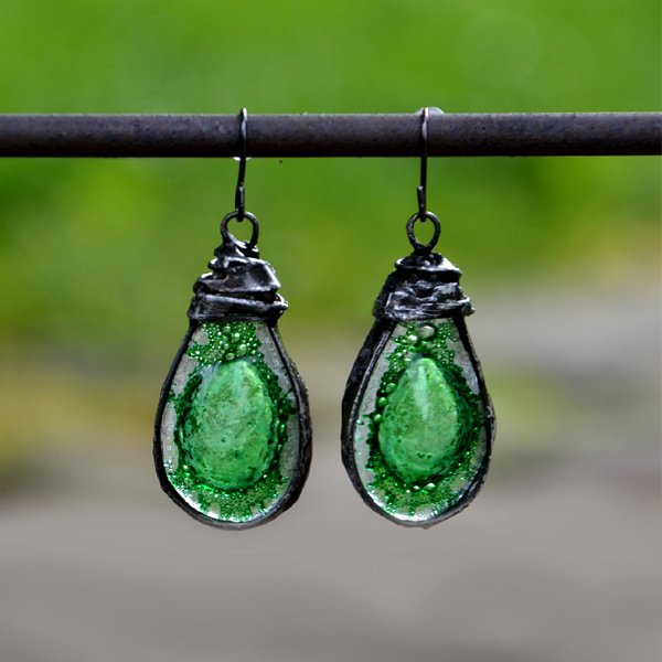 Niezwykłe, niepowtarzalne kolczyki ze szkłem. Oprawa w kolorze starego srebra nadaje kolczykom uroku. Długość całego kolczyka to ok. 5 cm. Biżuteria w 100% wykonana ręcznie, poszczególne sztuki mogą się minimalnie różnić.