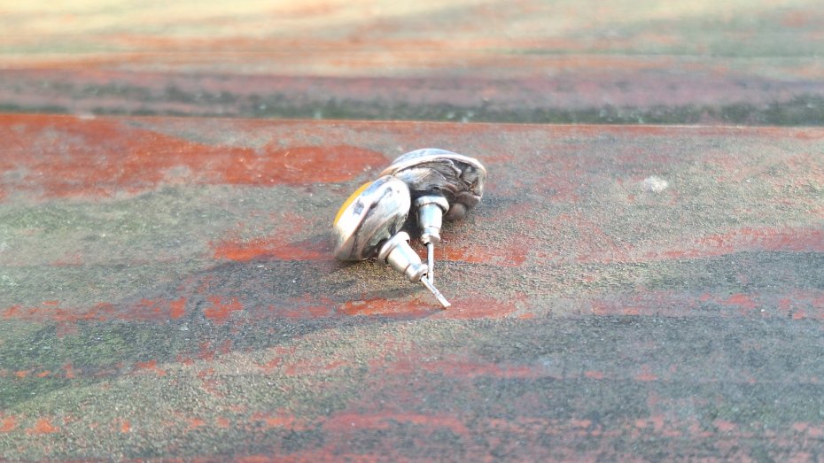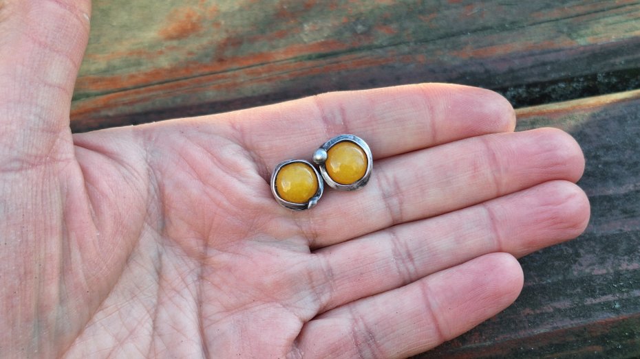 Kolczyki wykonane z miedzi, cyny i jadeitów. Średnica ok. 1 cm. Sztyfty ze stali nierdzewnej. Kolczyki nie są idealnie równe.