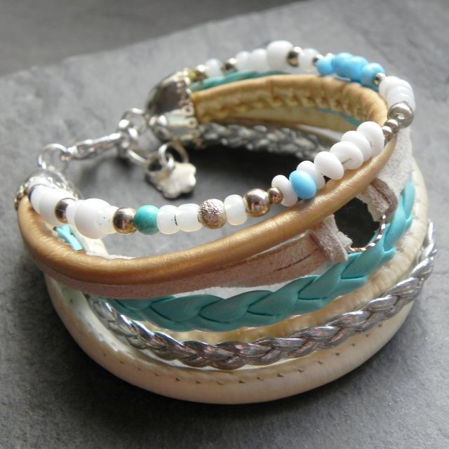 Bransoletka w stylu boho, wykonana tylko w JEDNYM EGZEMPLARZU, z różnorodnych rzemieni ze skóry ekologicznej, koralików Toho oraz elementów w kolorze srebrnym . Bransoletka będzie odpowiednia na nadgarstek 16-17,5 cm.