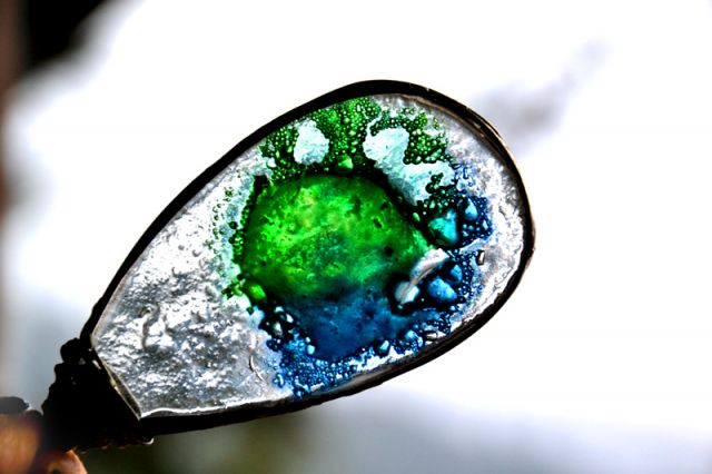 Przedstawiam niezwykły wisior ze szkłem. Szkło z mnóstwem bąbelków w środku. Długość zawieszki to ok. 9 cm. Wisior oprawiony w cynę stylizowaną na stare srebro i zawieszony na długim łańcuchu. Biżuteria w 100% wykonana ręcznie, poszczególne egzemplarze mogą się minimalnie różnić.
