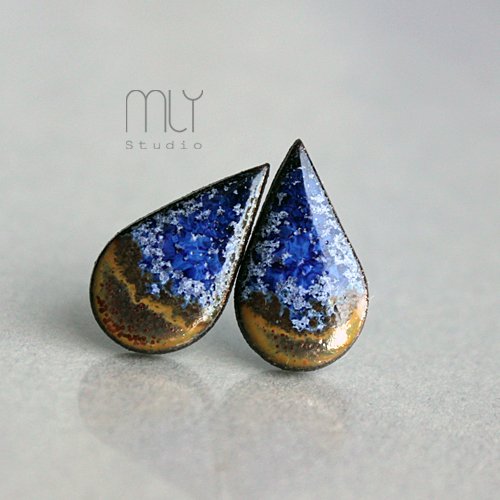 Oryginalne ceramiczne kolczyki w formie sztyftów, ręcznie wykonane z delikatnej gliny kamionkowej, jednostronnie szkliwione złotym i błękitnym błyszczącym szkliwem z efektem plamek, na antyalergicznych sztyftach w kolorze srebrnym. Długość ok 18mm. . Termin realizacji zamówienia to 1-2 dni