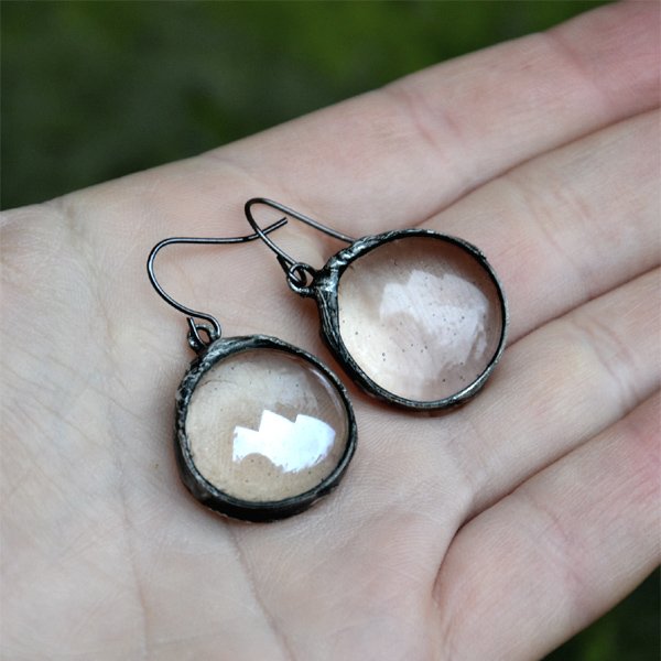 Niewielkie, lekkie, idealne na lato kolczyki z przeźroczystymi, połyskującymi szkiełkami. Oprawa w kolorze starego srebra nadaje kolczykom uroku. Długość całego kolczyka to ok. 3,5 cm. Biżuteria w 100% wykonana ręcznie, poszczególne sztuki mogą się minimalnie różnić.