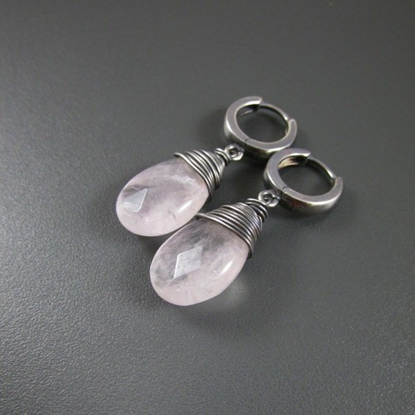 Kolczyki wykonane z fasetowanych kropli kwarcu różowego 16*12 mm. Całość oprawiona w srebro 925, oksydowane i wypolerowane. Długość całkowita kolczyków wynosi ok. 35 mm. Elegancko zapakowane.