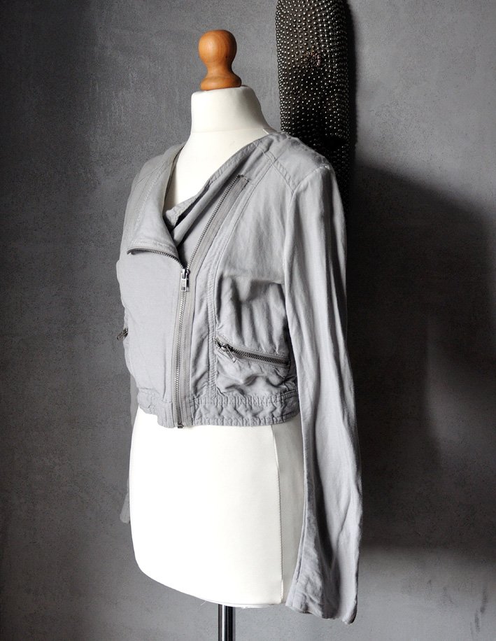 Fason krótszy, raczej dopasowany; zapinany na ukośny suwak. Rękawy długie, także z zamkami. PO bokach małe, zapinane na zamek kieszonki.