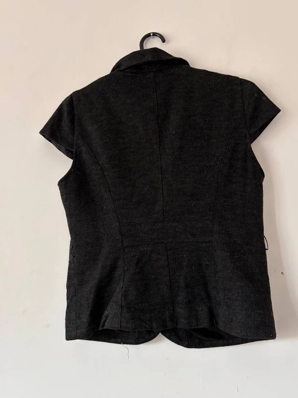 Model z krótkim rękawkiem, zapinany na jeden guzik, z delikatnym kołnierzem i dwiema kieszonkami z przodu.